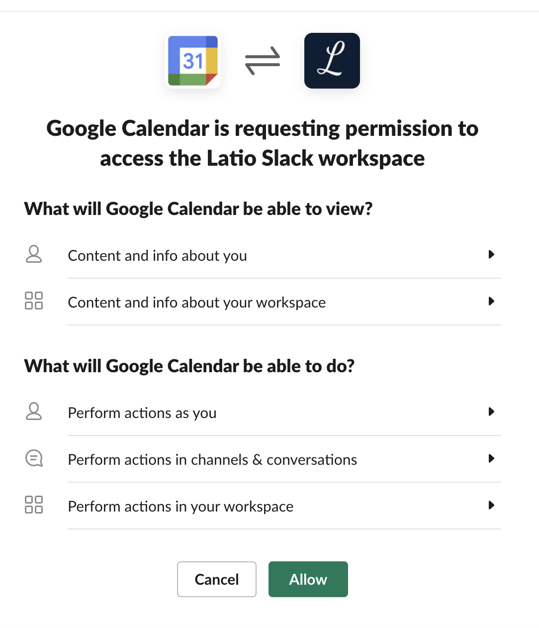Whether you know it or not, you and your employees are using “OAuth” to access applications dozens of times a day. OAuth security is best explained via a use case: let’s say you’re adding the Google Calendar Application into your Slack environment. You’ll be hit with a screen like this: