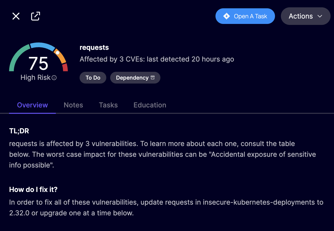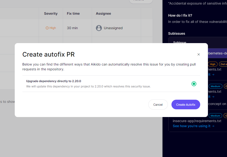 I like the way that Aikido groups the findings more, but the results were basically identical between the Fix Advice tab and what Aikido was showing. Similarly, I can see the necessary fix versions and options for patching, as well as open tickets or Jira for remediation. Snyk however had slightly more detailed write ups for vulnerabilities where applicable, but the overall descriptions were generally comparable.