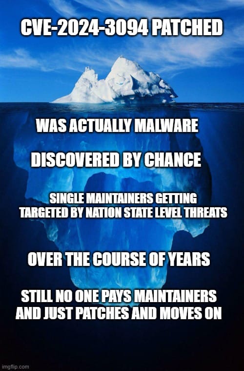 - This excellent timeline shows how these catastrophic attempts are led by human problems. Our entire software industry is being help up by single open source maintainers who get no credit, money, or recognition for their critical services. This shouldn’t be thought of as much as an isolated vulnerability as much as the tip of the supply chain iceberg.