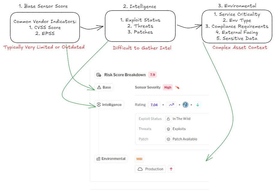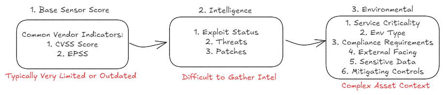 In order to try and account for environmental context, CVSS offers temporal and environmental score adjustments for CVSS. The problem? This is not at all scalable. In prior roles, I experimented with using LLMs to fill this out, environmental contexts, all sorts of things, but it never quite worked correctly.