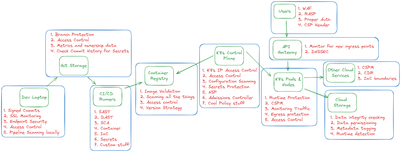 Now that you have your diagram, you can begin thinking about your existing security tooling, and if it’s really a good fit or not. If you have a traditional security stack, it’s possible that your SIEM is ingesting some of these logs but has other gaps, for example application logs but not Kubernetes audit logs.