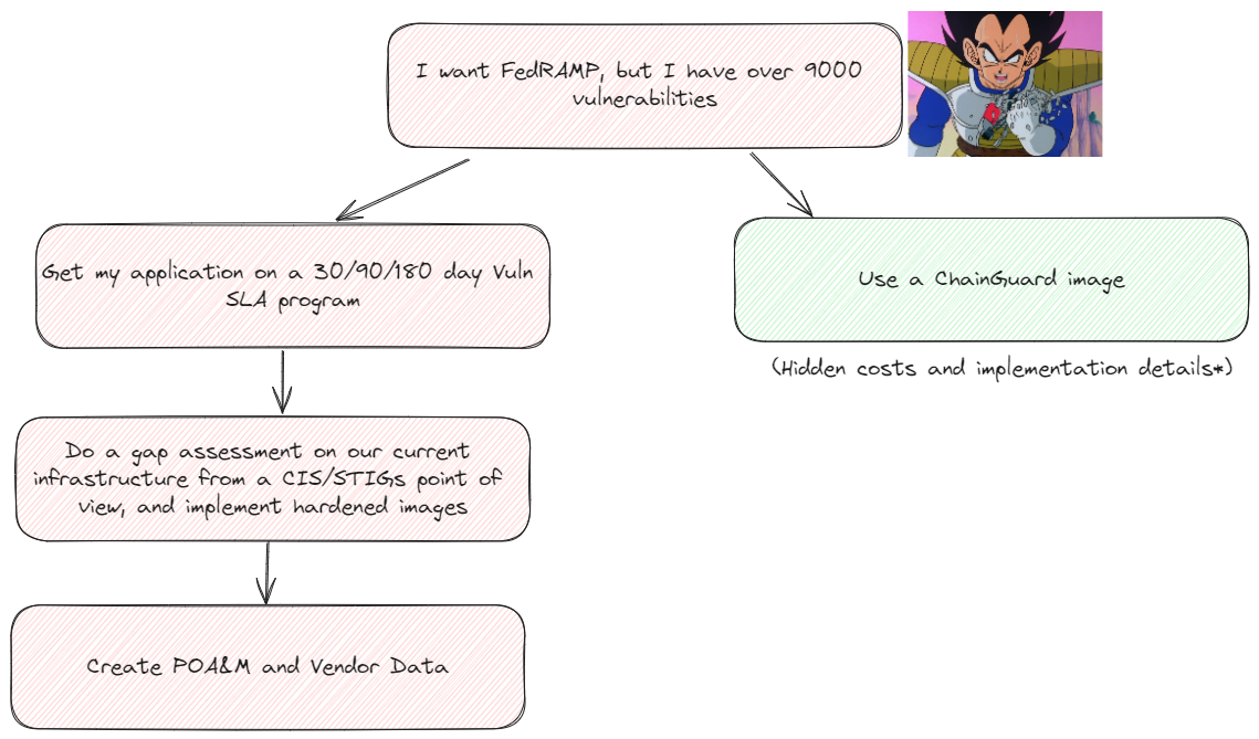 Choosing a distro for your container base images is super complex, and really dependent on your environment - a great overview video is here. Security teams are usually pretty detached from these choices, and these decisions are typically guided by deciding what the easiest thing is to get working the fastest. When a pitch like ChainGuard’s comes along, it becomes “would you rather spend 6 months getting your exiting infrastructure compliant, or spend maybe less than that switching over to our images for your FedRAMP environment?” When framed this way, ChainGuard comes across as an obvious purchase.