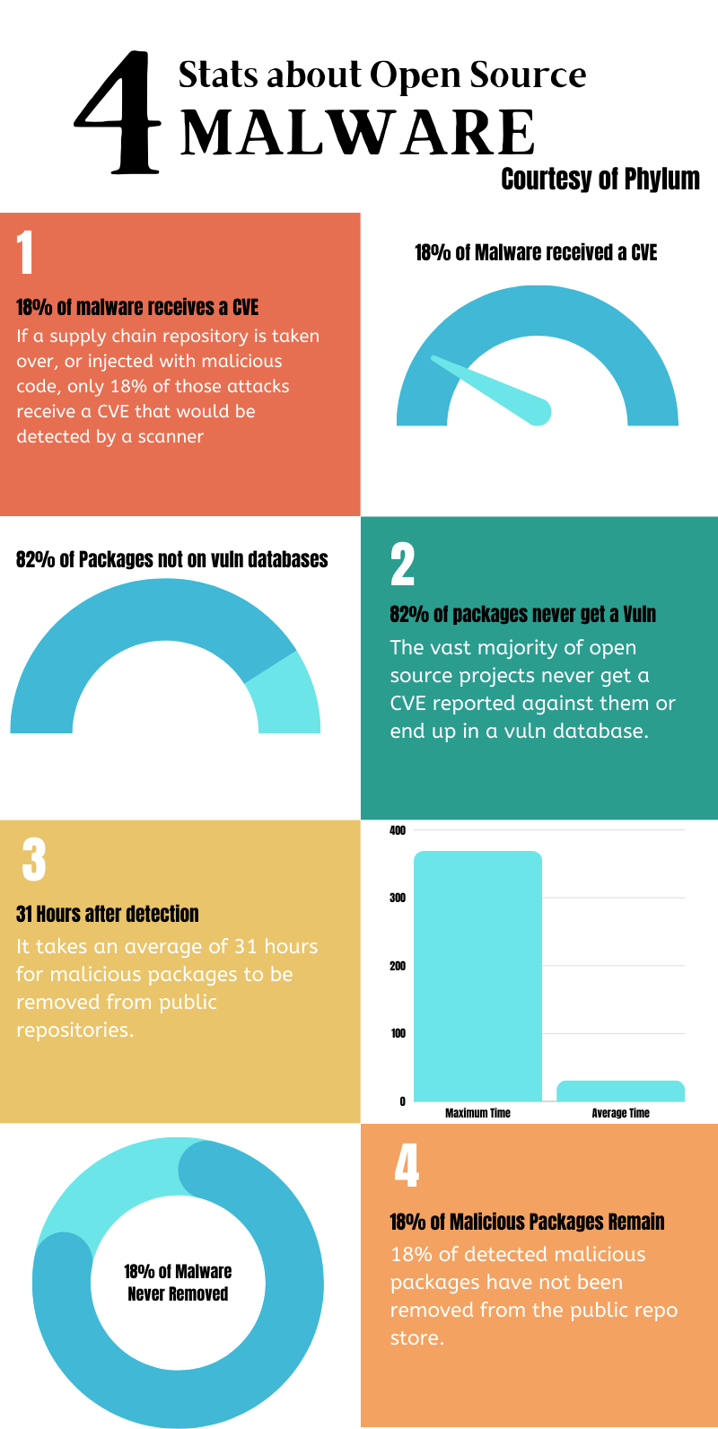 - Only 18% of malware detections in open source libraries received a CVE or known vulnerability in a third party database.