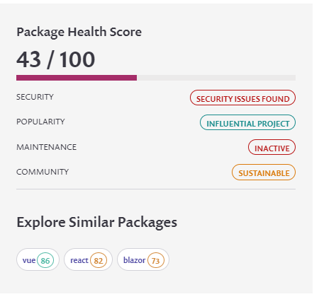 I’ve come to believe that the general health of a public repository offers a more holistic understanding of the security threat of using a package than CVEs. CVEs still definitely matter, and are of course an indicator of issues; however, what really matters is how likely a CVE is to be fixed, or even identified in the first place! The 3 star 1 maintainer open source repository powering your frontend is unlikely to get a CVE published against it, but very likely to be vulnerable in some way.