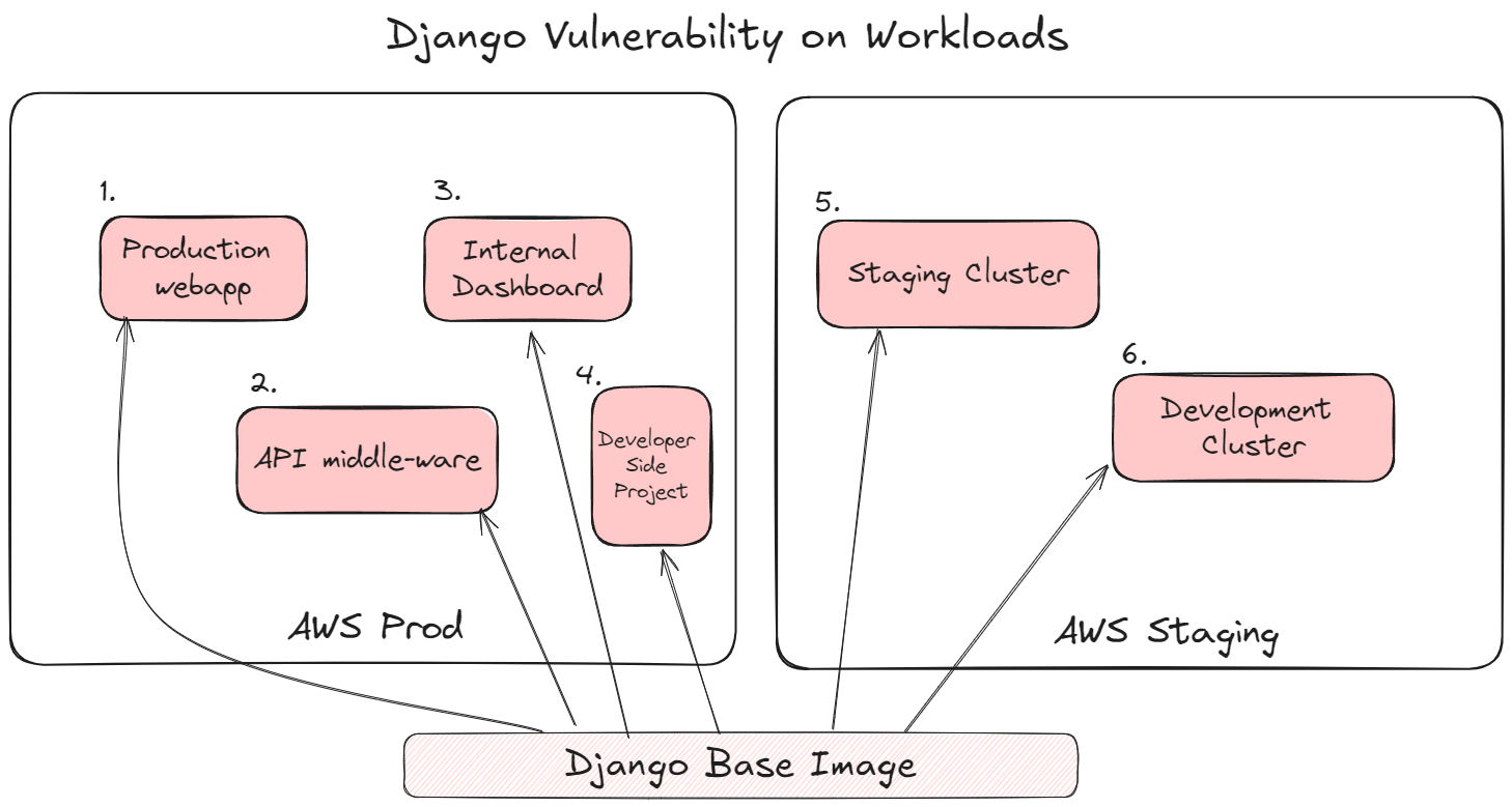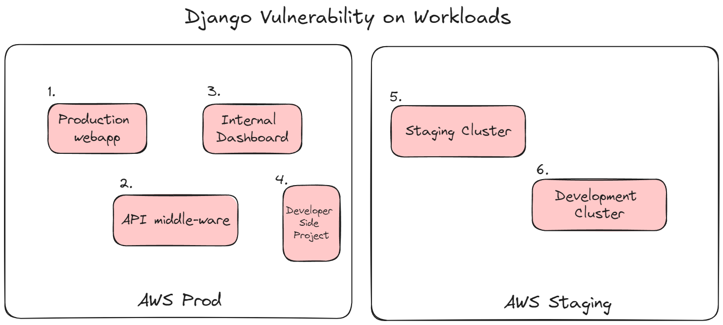 Let’s use a real world example to discuss the importance of asset context with vulnerability remediation. In this example, a primarily Django developer shop uses Django across a variety of different workloads. A new vulnerability is discovered in Django, so the security team is dealing with at least 6 identical alerts here - with only the asset’s location differentiating them.
