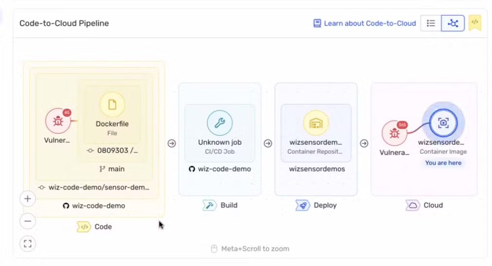 - Code to cloud is the holy grail of vulnerability remediation. There are a lot of ways to try and build this graph, but no matter how someone tries to do it, it’s really hard. Wiz deserves props for threading an elegant middle ground in making this usable, especially in the enterprise. The WizCLI scans in pipeline, scrapes metadata to associate the committer and repo, and tags the image (also counts as integrity checking). The tag is used to trace the container back to the repo that produced it. This isn’t the most advanced approach I’ve seen, but it’s one of the only ways to get a guaranteed match between a repo and a deployed container.