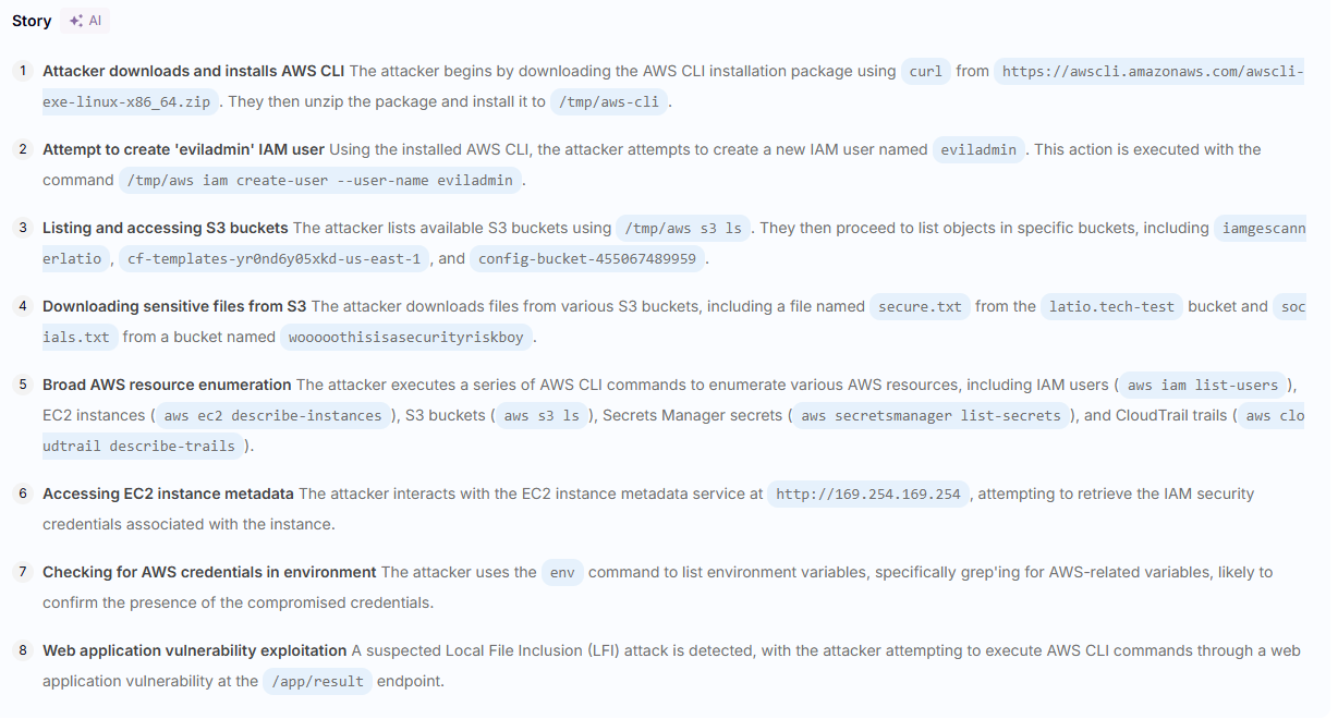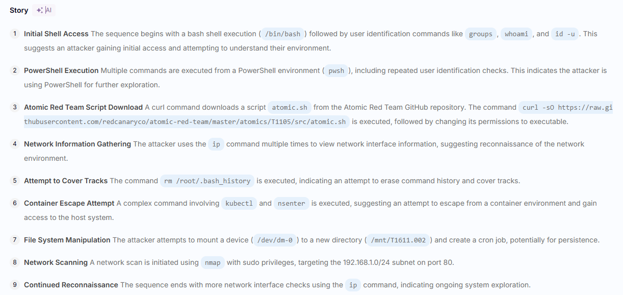 For example, when running a series of Atomic Red Team tests, including container escapes and file manipulations, Sweet correctly identified each technique and grouped them into a single, understandable attack chain. The tool provided clear details about what was run, which pods were involved, and how the activity unfolded. It also offered full process logs for investigation.