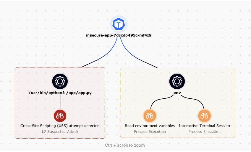 If you’re new to cloud security, you may not instantly recognize how cool the above screenshot attack story is. In isolation, a DevOps team member might look at the environment variables in a running pod, triggering an alert that an analyst has to go and hunt down; however, a DevOps team is never running an XML injection payload before doing that. This is a critical example of where the application layer enables meaningful response.