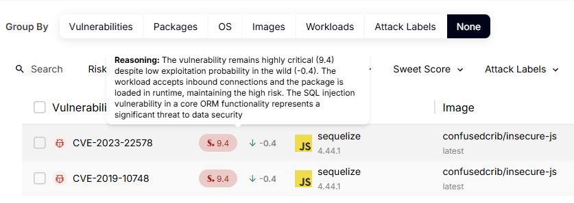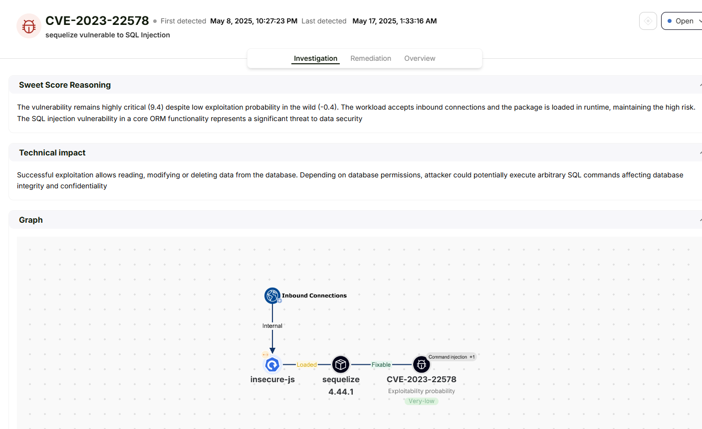 Sweet includes vulnerability discovery and management capabilities amplified by runtime data and LLM based prioritization. At a basic level, Sweet can prioritize with the standard loaded/executed and network reachability distinctions. For the execution detection, reliability seemed based on language, and I didn’t see any function level reachability happening. This data carries into detection by optionally integrating your container registry.