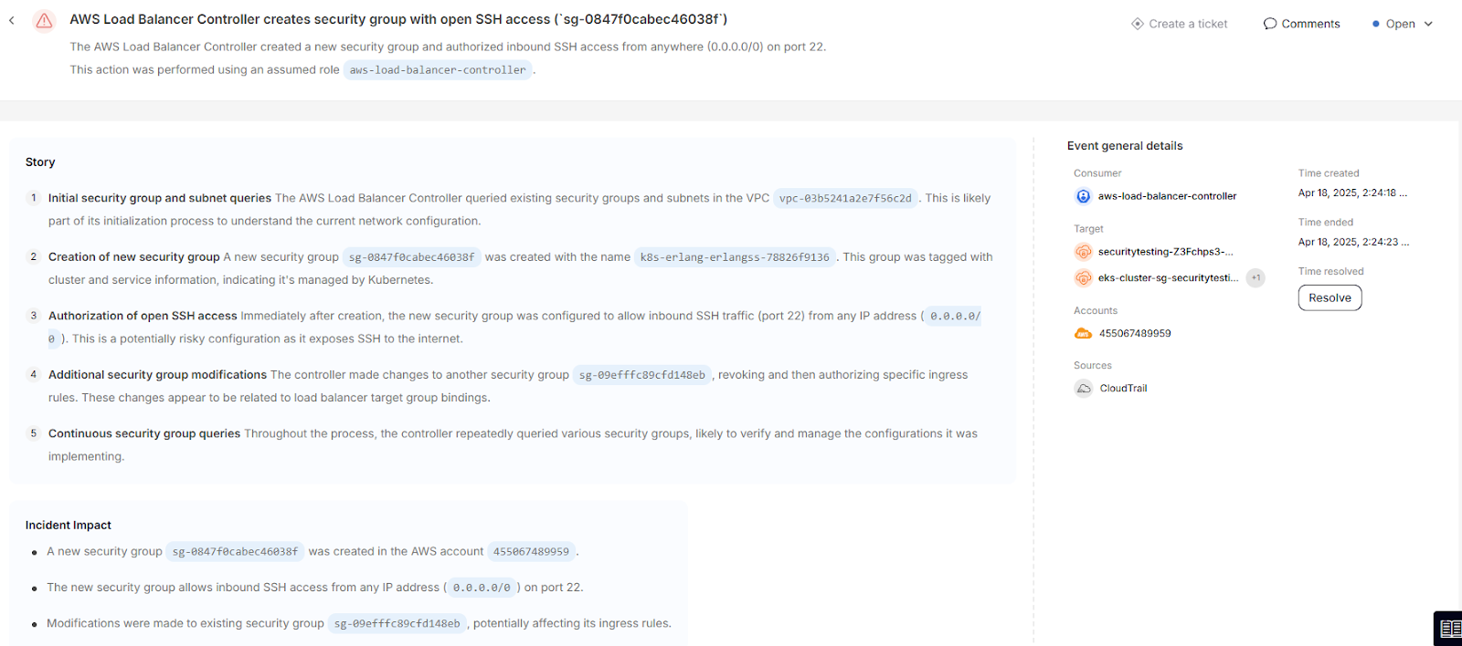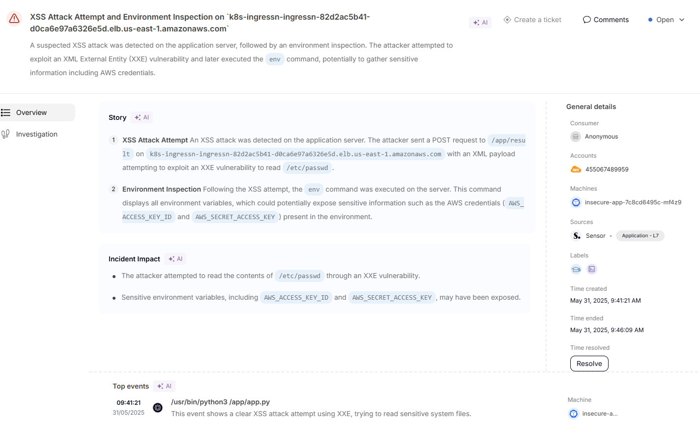 Let’s start where Sweet was the strongest. In testing, Sweet stood out for its approach to incident correlation. Where other detection tools tend to drown you in alerts, often firing off dozens of findings for a single attack sequence, Sweet does a much better job summarizing what happened into a single understandable attack chain. It ties together bash execution, container drift, file tampering, and network behavior into a coherent incident view.