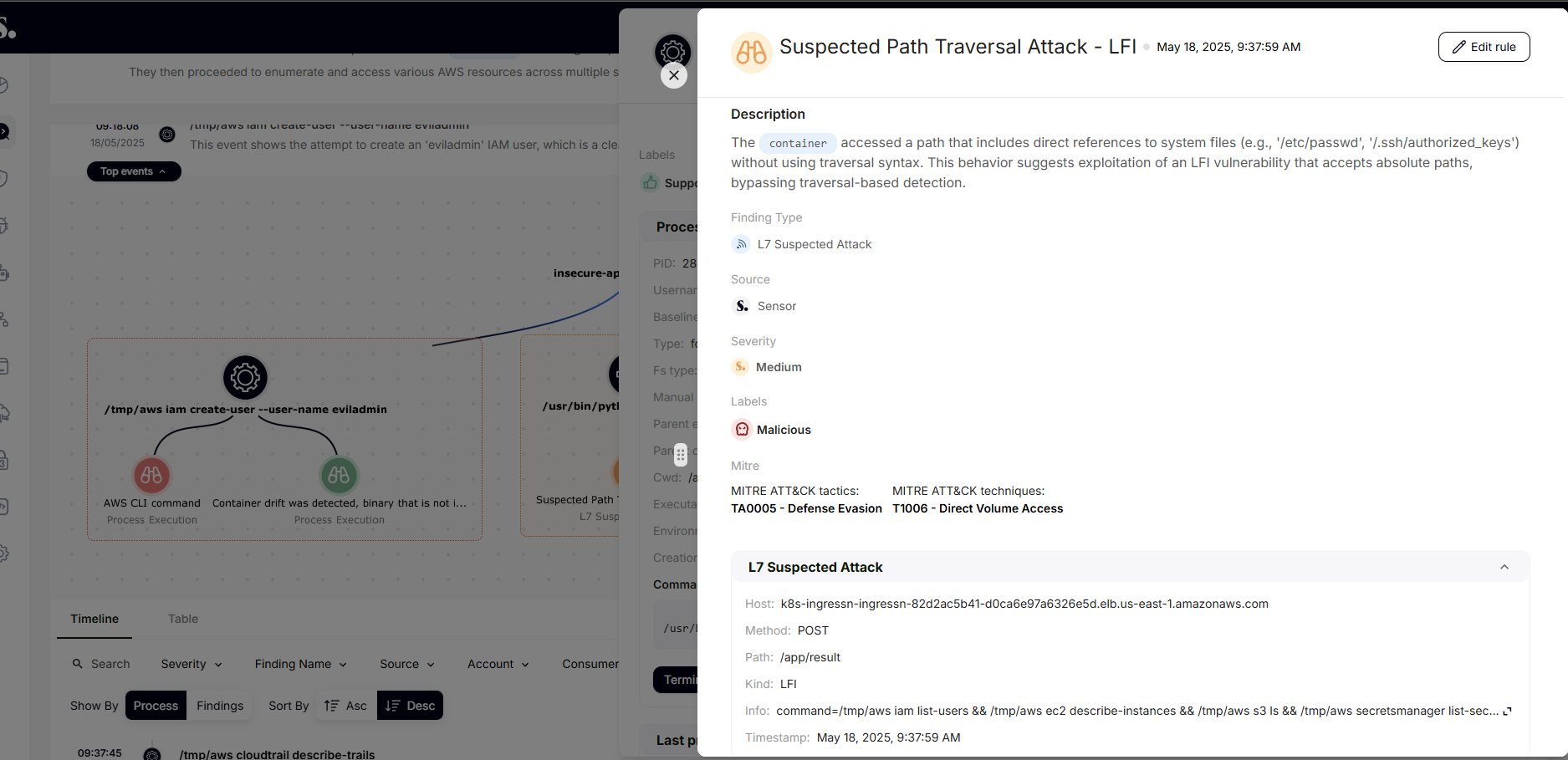 It’s also worth mentioning how the detection capabilities cross between API, cloud and workload layers. Sweet applies this detection methodology across all of the attack layers to identify when attacks pivot into the cloud from the workload.