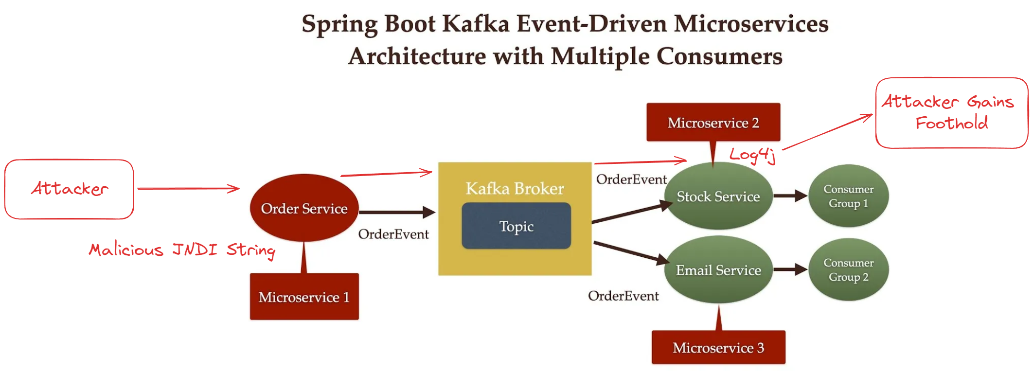 At this point, there are some tools that can draw this diagram with varying degrees of success; however, let’s say an attack has discovered a vulnerability with the way our Email Service parses email messages from the Kafka broker, which is AWS Managed Kafka (MSK). They publish a malicious string through the order service, it gets written to the broker and then consumed by the email service, which then gives them a foothold into your infrastructure.
